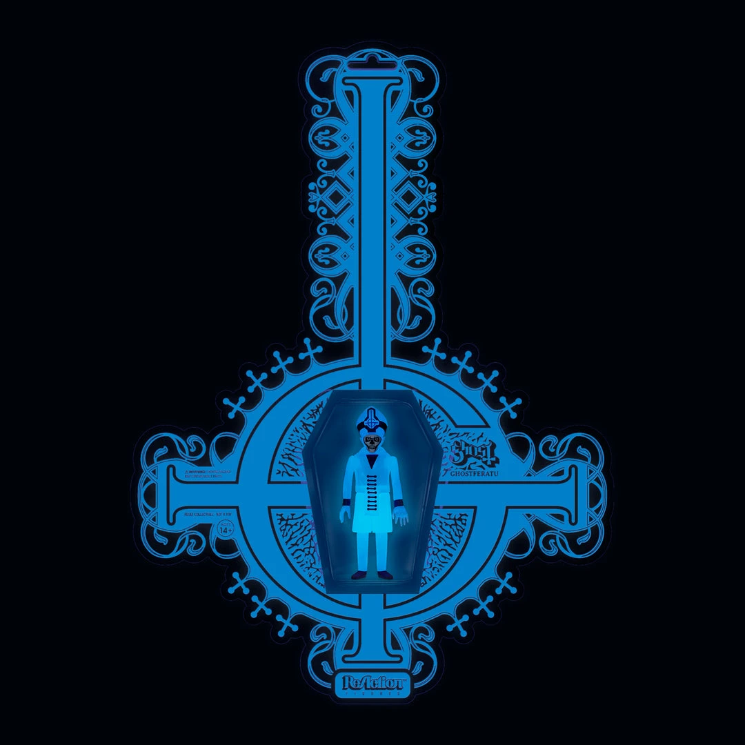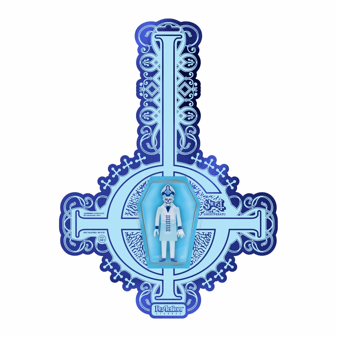 The collaboration between Super7 and rock’s most mysterious band Ghost continues with the Ghostferatu glow-in-the dark 3.75” ReAction figure! Inspired by the cover art from the band’s 2013 If You Have Ghost EP, the Ghosferatu figure is glow-in-the-dark translucent blue on a beautiful foil embossed Grucifix card.