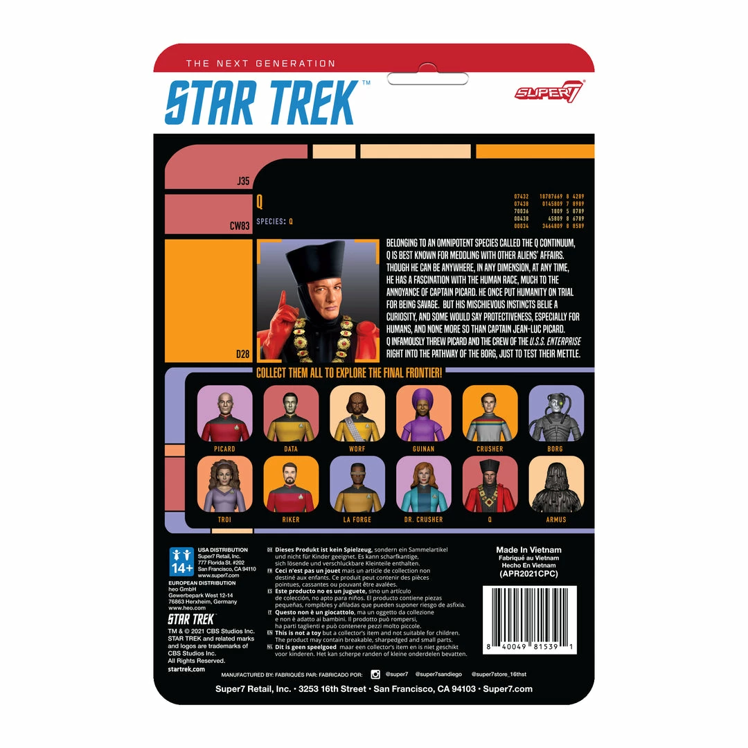 A mercurial member of the race of god-like beings from the Q-Continuum, “Q”, as he becomes known, often presents the crew of the USS Enterprise with their most daunting challenges. Whether putting the human race on trial for its very existence, exposing humanity to The Borg for the first time, or any of his other ominous schemes, Q never ceases to be a formidable foil to all whom he encounters. This 3.75” articulated Star Trek: The Next Generation ReAction Figure depicts Q in his judge’s regalia, complete with head-piece, red robes, and medallion. As one of the most notable recurring antagonists, your collection would be incomplete without the Star Trek: The Next Generation ReAction Figure of Q!