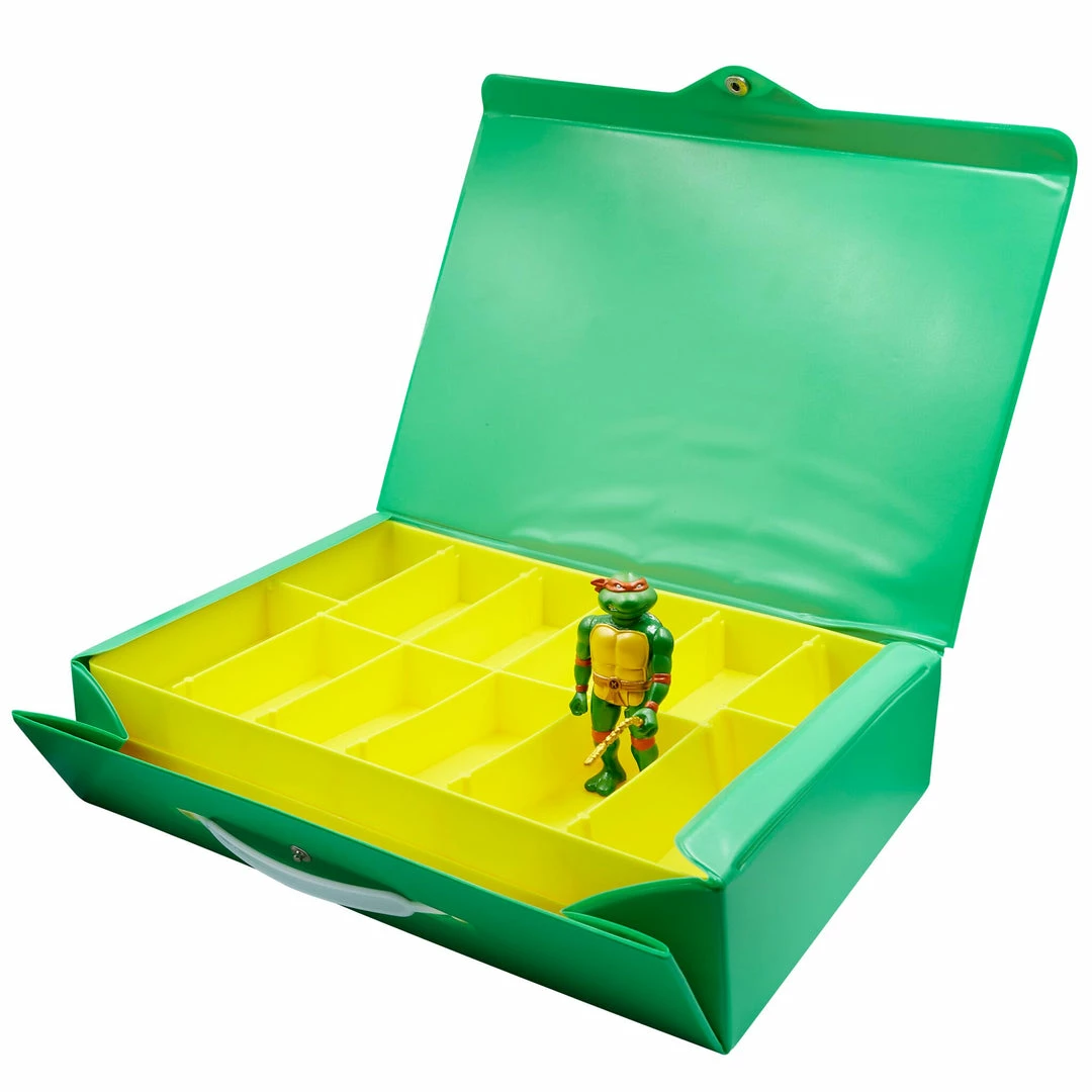 Super7βs turtle shell embossed TMNT Carry Case comes with an exclusive metallic Michelangelo ReAction figure and can hold up to 24 ReAction figures in two inner trays! The trays can perform double-duty and serve as a display stand for your figures, complete with foot-pegs to anchor your 3.75β ReAction figures in place. An exclusive sticker sheet is also included so you can customize your case! What better way for any Teenage Mutant Ninja Turtles collector to store or show off their beloved ReAction figures!
