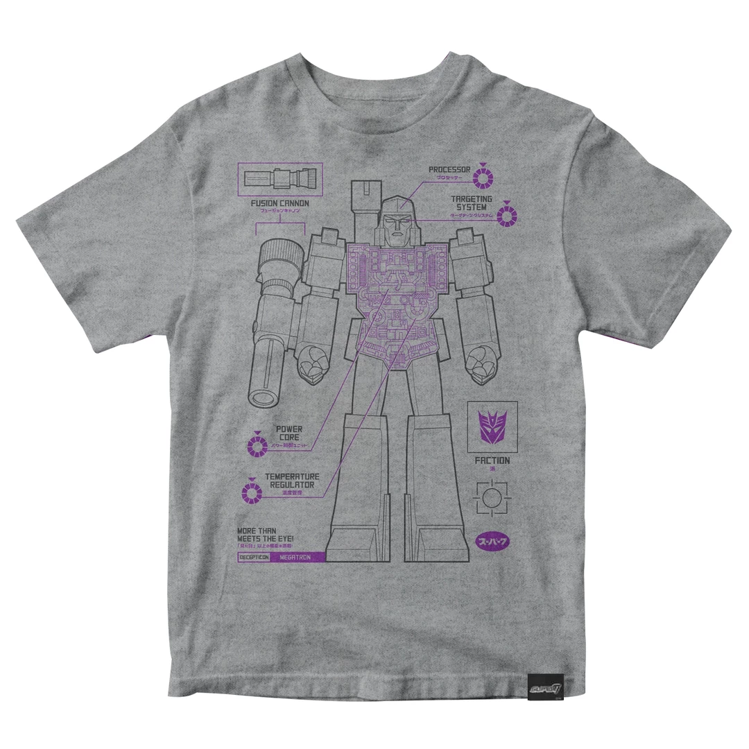 The Super7 exclusive Megatron Cyborg Diagram T-Shirt! Available in unisex sizes SM – 3X with Super7 hem tag. Tee color: Grey. Short sleeve 100% cotton machine wash / tumble dry.